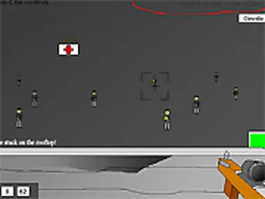 A first person shooter where you move from area to area shooting poorly drawn people.