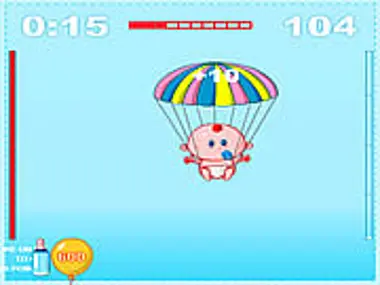 Control a baby hanging on a parachute and catch the bottles with milk.