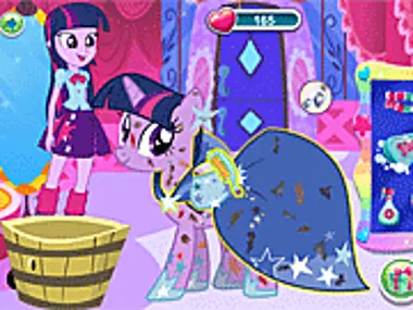 كانت توايلايت سباركل سعيدة جدًا بعد حفلها الأخير، وبالغت قليلاً في حفلة ما بعد الحفل. ذهبت في جولة في الحديقة لتستنشق بعض الهواء النقي، واتسخت كثيرًا. مهمتك هي تنظيف توايلايت وزيها المسرحي. استخدم الأدوات وأزل كل الأوساخ والأغصان من شعر توايلايت. في لمح البصر، ستبدو رائعة وستكون جاهزة للعودة إلى الحفل.