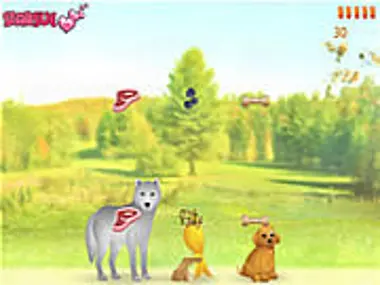 Dog and cat food is falling from the sky and you have to get it and feed it to them.