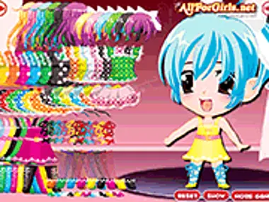 ساعدي فتاة الأنمي اللطيفة هذه في اختيار أجمل الملابس من خزانة ملابسها وقومي بتلبيسها. لا تنسي أن تختاري لها تسريحة شعر لطيفة أيضاً! استمتعي بلعبة تلبيس الفتاة الصغيرة هذه!