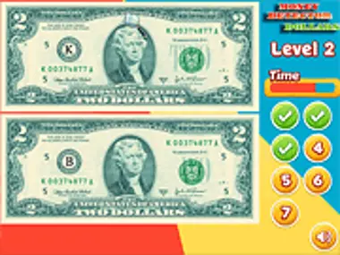 اكتشف سبعة اختلافات في صور متطابقة لأوراق الدولار من فئات 1 و 2 و 5 و 10 و 20. أكمل خمسة مستويات، واكتشف جميع الاختلافات في كل مستوى، واحصل على خمس عشرة نجمة.