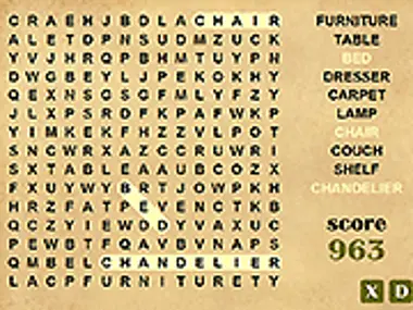 الجزء الخامس من لغز الكلمات المتقاطعة الشهير لأصحاب الدرجات العالية، هذه المرة بكلمات تتعلق بالأثاث! ابحث عن جميع الكلمات من القائمة بأسرع ما يمكن! اضغط على الحرف واسحب لاختيار كلمة! درجتك تعتمد على سرعتك!